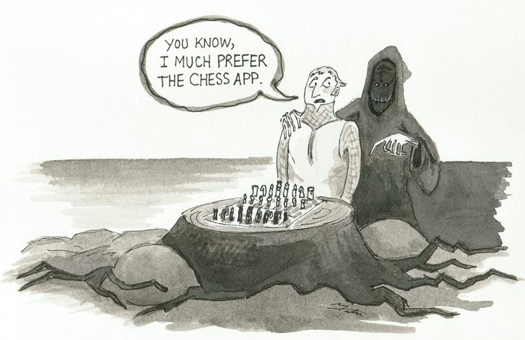 You may be familiar with the Monty Python bit found in the final act of “The Meaning of Life” in which “death” aka the Grim Reaper crashes a country cottage dinner party, or perhaps the segments featuring he (or rather, it) that are found in Woody Allen movies “Love and Death” and “Deconstructing Harry.” And whether you’ve seen the film or not, you are certainly familiar with the famous imagery in Ingmar Bergman’s “The Seventh Seal” showing a medieval knight partaking in a game of chess vs. the dark-cloaked one.